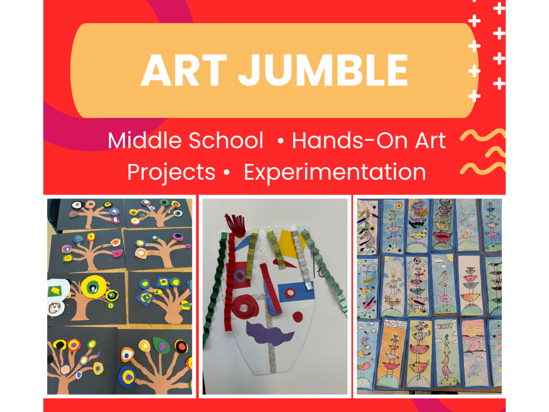 Art Jumble is an action-packed, hands-on course designed for middle school students to explore a wide variety of art materials and techniques. Through engaging, project-based lessons, students will experiment with different mediums while building confidence, creativity, and problem-solving skills.